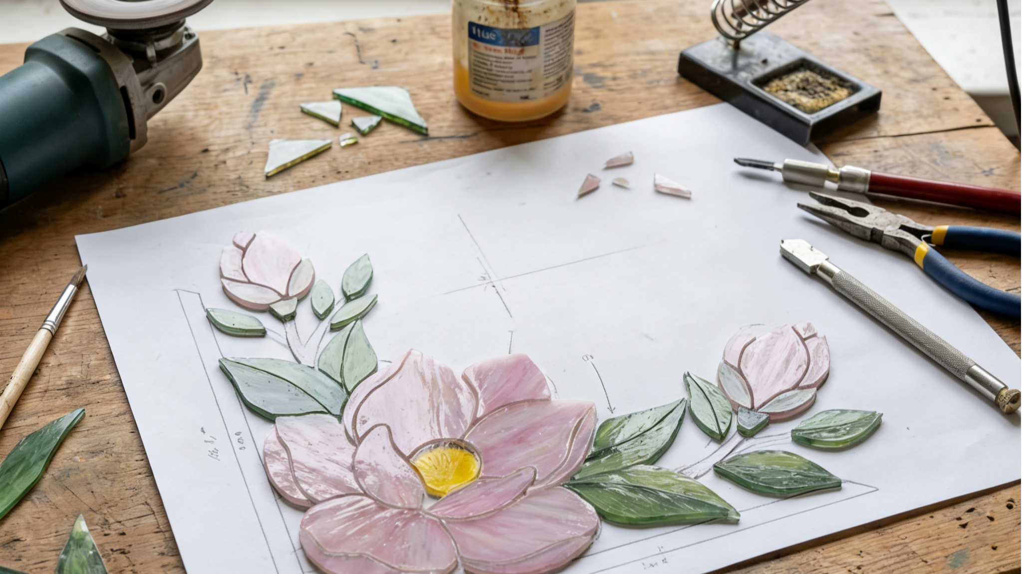 We cut high-quality art glass sheets into precise petals, leaves, and decorative parts using specialized tools. The curves and details match the original sketch.